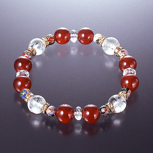 白水晶4個(10mm珠 四神獣刻印)、4個(8×4mm/カット)、赤メノウ8個(10mm珠)、七宝焼8個(6mm珠)、ロンデル8個(6×3mm 真鍮/ラインストーン)