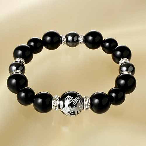 オニキス1個(14mm珠 龍刻印)、8個(12mm珠)、4個(10mm珠)、ヘマタイト3個(10mm珠)、ロンデル2個(8×4mm 真鍮/ラインストーン)、6個(6×3mm 真鍮/ラインストーン)