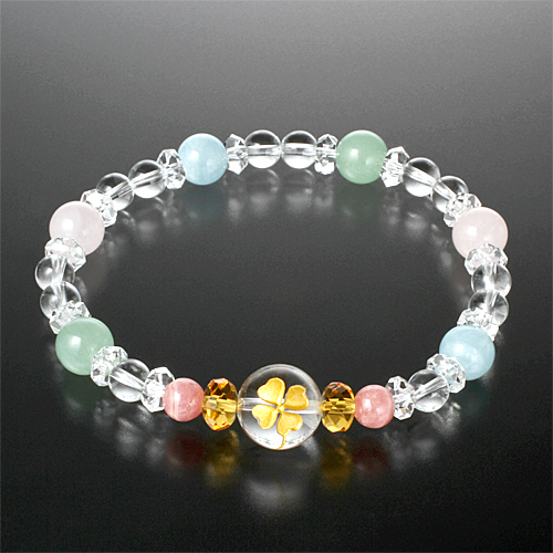 白水晶1個(12mm珠 クローバー刻印)、12個(6mm珠)、14個(6×3mm/カット)、黄水晶2個(8×4mm/カット)、 アクアマリン2個(8mm珠)、インカローズ2個(6mm珠)、ローズクォーツ2個(8mm珠)、アベンチュリン2個(8mm珠)