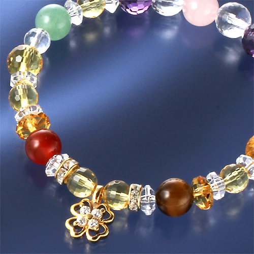 クローバーパーツ1個(17×10mm 真鍮/ジルコニア)、白水晶2個(8mm珠/128面カット)、2個(6mm珠/128面カット)、10個(6×3mm/カット)、黄水晶1個(8mm珠/128面カット)、6個(6mm珠/128面カット)、2個(8×4mm/カット)、爆裂黄水晶1個(8mm珠)、アメジスト2個(8mm珠/128面カット)、虎目石1個(8mm珠)、赤メノウ1個(8mm珠)、青メノウ1個(8mm珠)、ローズクォーツ1個(8mm珠)、アベンチュリン1個(8mm珠)、ロンデル2個(6×3mm 真鍮/ラインストーン)