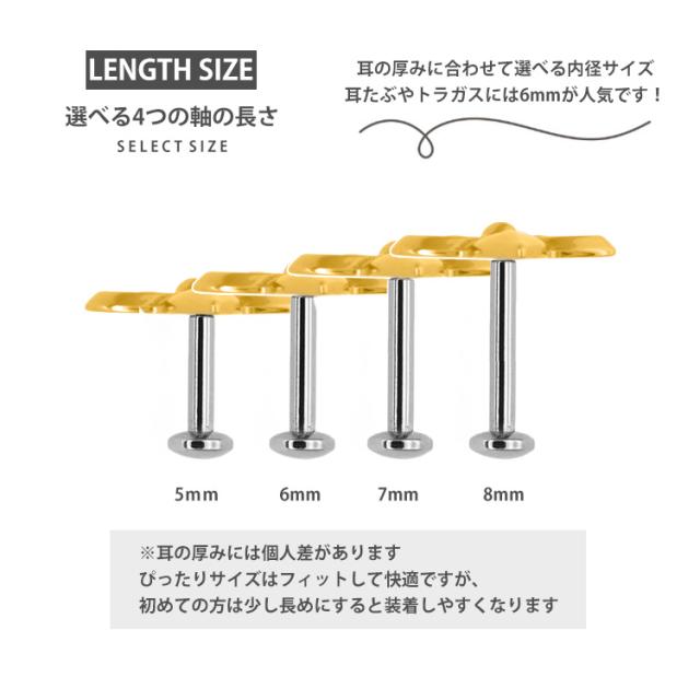 ボディピアスの定番アイテム、ラブレットスタッドがワンプッシュタイプの斬新設計に。 ありそうでなかった、ネジ不使用のボディピアスが登場。トラガスのような狭い部位や、ネジタイプが苦手な方には特にお勧めです。 トラガスのような狭い部位や、ネジタイプが苦手な方には特にお勧めです。