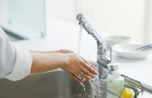 ○流水の場合、野菜・果物は30秒以上、食器および調理用具は5秒以上、ため水の場合は水をかえて2回以上すすぐ。