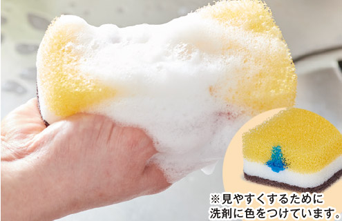 少量で泡立ち、泡切れのいい台所用洗剤はダスキンの台所用スポンジでのご使用でさらに効果的に!3層構造の目の細かいスポンジの中間層に洗剤が素早く届いて保持することで、たっぷりの泡が続きます。