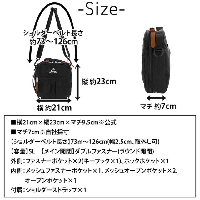 | サイズ(約) ※当店実寸値 | 公式サイズ 横21cm×縦23cm×マチ9.5cm 自社採寸サイズ マチ7cm 【ショルダーベルト長さ】73m〜126cm(幅2.5cm、取外し可) 【容量】5L | ||