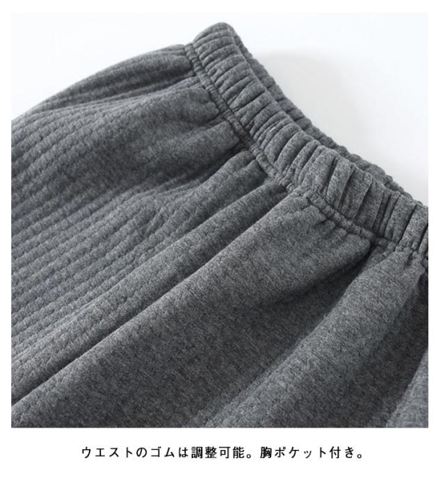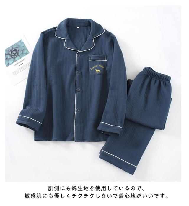 | 【綿のキルト素材 パジャマ上下セット 暖かい 秋冬用】 やわらかい肌触りの良い綿100%キルトニットの紳士用パジャマ上下セット。 衿付き、前ボタンで着やすく、入院時もおすすめです。 裏起毛でなくても、中綿を入れることで暖かく、綿生地で挟むことで、ふっくらふんわりとした優しい着心地。 保温性・吸水性・通気性があり、肌にも優しい生地です。 また吸水性が高く、静電気が起きにくいのが特徴。 肌側にも綿生地を使用しているので、敏感肌にも優しくチクチクしないで着心地がいいです。 テーラード襟付きでパイピングがアクセントでシンプルでオシャレ。 ウエストのゴムは調整可能。胸ポケット付き。 前開き、ボタン開閉で、ご自宅だけでなく、入院時などでもお勧めです。 | |