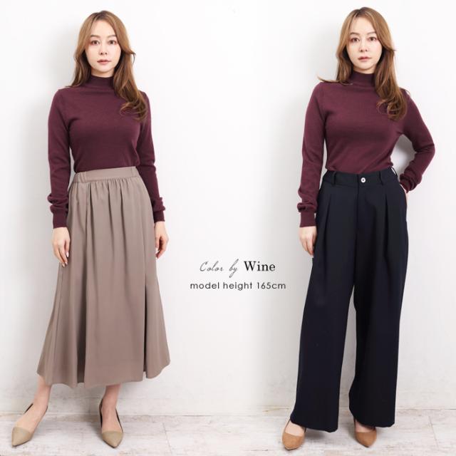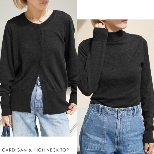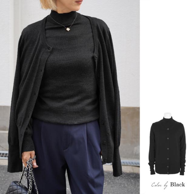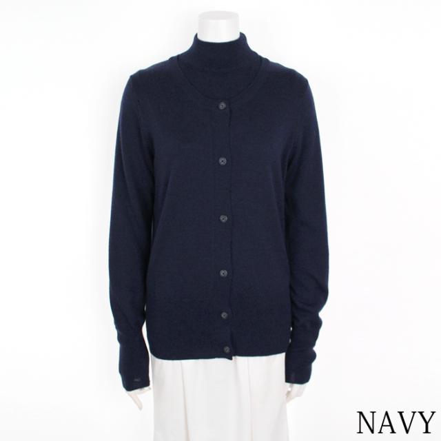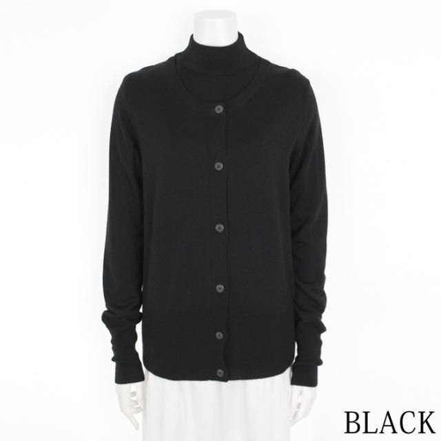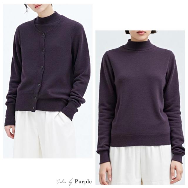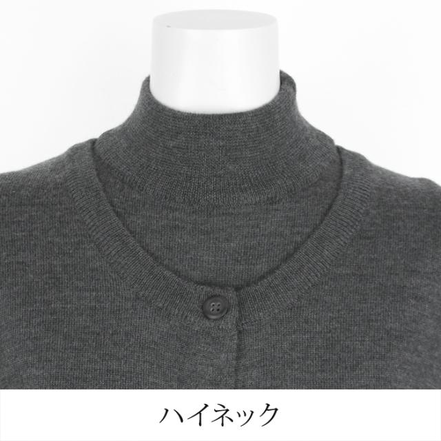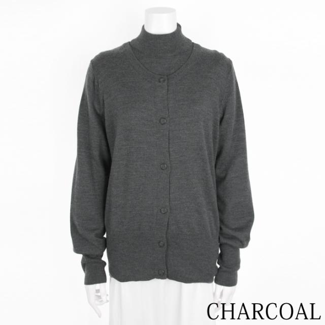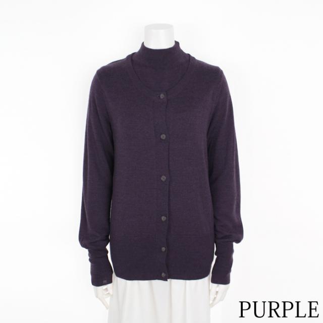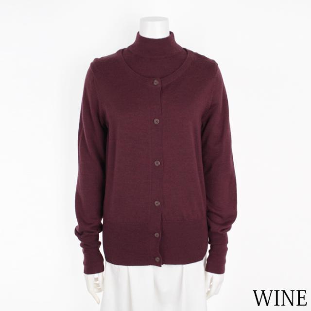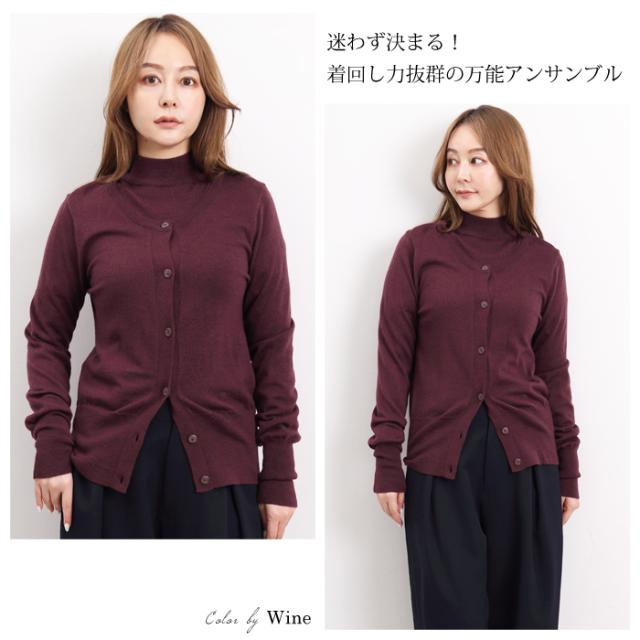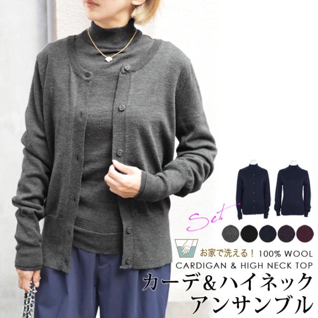 送料無料 アンサンブル レディース トップス カーデ ハイネック ニット ウール100% 長袖 無地 チャコール ブラック ワイン パープル ネイビー[10716]