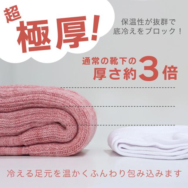 寒い季節の足元を贅沢に包み込む、2重編み構造の極厚ソックス3足セットです。通常の靴下の約3倍の厚みがあり、抜群の保温性を実現。履き口から足首部分までは特殊な2重構造により、長い靴下を半分に折り返して使用することで、さらに暖かさが2倍に。パイル編みの内側が足を優しく包み込み、冷えやすい足元をしっかりと温めます。サイズは22-25cmで、ゆったりとした履き心地。家でくつろぐ時のルームソックスとしても最適です。ブルー、ピンク、ベージュの3色セットで、コーディネートも楽しめます。寒い冬でも足元から温かく、快適な履き心地を提供する理想的な防寒アイテムです。