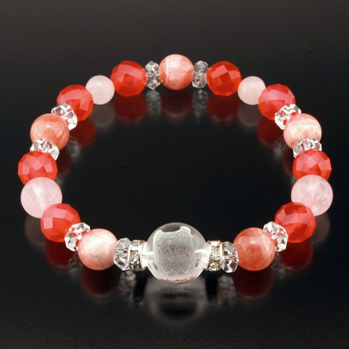 白水晶1個(12mm珠 梟刻印)、10個(6×3mm/カット)、ローズクォーツ2個(8mm珠)、2個(6mm珠)、インカローズ5個(8mm珠)、バラ色メノウ8個(8mm珠/カット)、ロンデル2個(6×3mm 真鍮/ラインストーン)[サイズ]約16cm(内周)[重量]約18g[中糸]ポリウレタンゴム[付属品]専用巾着袋、ジュエリー品質保証書[個装サイズ]縦15.8×横10.0×高さ2.0(cm)/28(g)