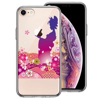 iPhone8 ケース クリア 日本女性 着物少女 青紫 ス