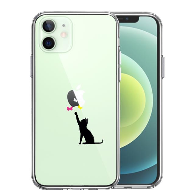 iPhone12mini ケース クリア 猫 CAT ねこ 蝶々 ブラック スマホケース 側面ソフト 背面ハード ハイブリッド