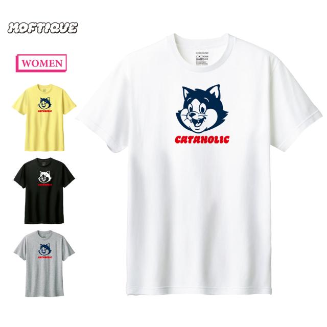 Moftique(モフティック) 半袖Tシャツ ロゴ キャットイラスト 猫 アニマル プリント 5.6オンス トップス カットソー レディース