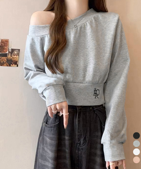 風 オフショルダートップス 春秋 ショート丈トレーナー 長袖スウェット 肌見せ お洒落 ダンス服 セクシーTシャツおしゃれカットソー 細見えトップス薄手 アンシンメトリー服