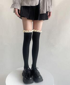 サイハイソックス レースドッキング 大人可愛い 膝上丈靴下 通学ルームソックス 暖かい靴下春秋冬 風無地ソックスおしゃれソックス黒 レッグウェアロング ロング靴下美脚脚長