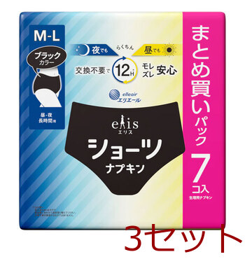 エリス ショーツ ナプキン 昼 夜 長時間用 ブラックカラー M〜Lサイズ 7個入 3セット 送料無料
