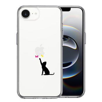 iPhone16e ケース クリア 猫 CAT ねこ 蝶々 ブラック スマホケース 側面ソフト 背面ハード ハイブリッド 送料無料