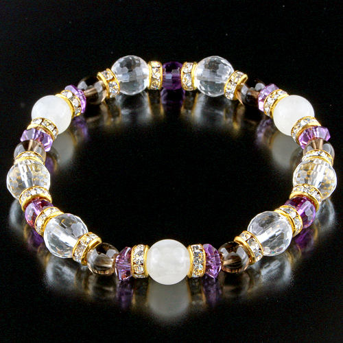 白水晶6個(8mmカット)、アメジスト3個(6mmカット)、6個(6×3mmカット)、スモーキークォーツ6個(6mm珠)、ムーンストーン3個(8mm珠)、ロンデル18個(6×3mm 真鍮/ラインストーン)