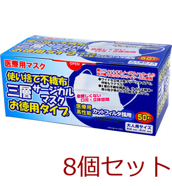 マスク 不織布 使い捨て不織布 三層サージカルマスク お徳用タイプ 大人用 50枚入 8セット 送料無料