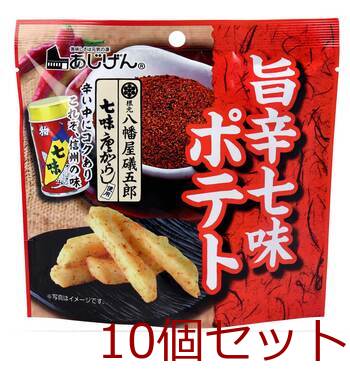 じゃがいも(遺伝子組換えでない)(中国)、植物油、七味唐辛子、コンソメシーズニング、食塩/調味料(アミノ酸等)、香料、微粒二酸化ケイ素、甘味料(ステビア)、香辛料抽出物、酸味料、着色料(カロチノイド)、(一部に小麦、大豆、ごま、鶏肉、豚肉を含む)