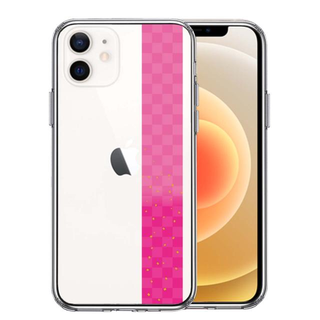 iPhone12mini ケース クリア 和柄 帯 市松模様 ピンク 金箔 スマホケース 側面ソフト 背面ハード ハイブリッド 送料無料