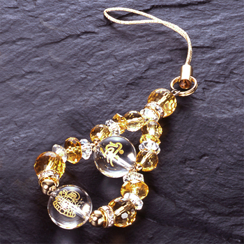白水晶1個(12mm珠 梵字刻印)、1個(12mm珠 守護神刻印)、7個(6×3mm/カット)、黄水晶3個(8mm珠/128面カット)、4個(6mm珠/128面カット)、2個(8×4mm/カット)、2個(6×3mm/カット)、ロンデル2個(6×3mm 真鍮/ラインストーン)、銅玉2個(5mm珠)、4個(2mm珠)