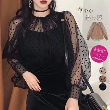 柔らかく軽いチュール生地に異素材ドット加工のシアートップスとキャミソールの2点セット