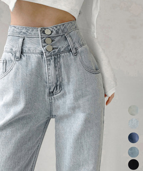 ウエストボタンは3つ付き、美脚シルエットにこだわった大人のハイウエストデニムパンツ。