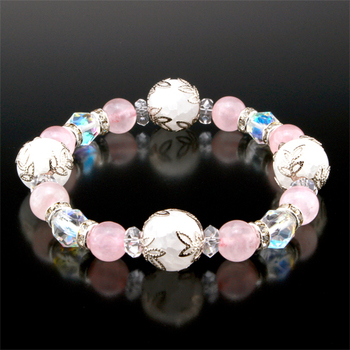 ルナフラッシュ4個(8mm珠/スターカット)、白水晶8個(6×3mm/カット)、爆裂白水晶4個(12mm珠 フロスト加工)、ローズクォーツ8個(8mm珠)、ロンデル8個(6×3mm 真鍮/ラインストーン)、ビーズキャップ8個(真鍮)