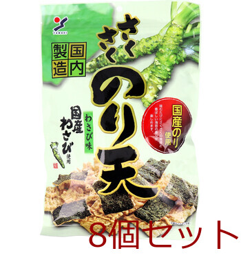 小麦粉(国内製造)、植物油脂、海苔、わさびシーズニング(グラニュー糖、食塩、粉末醤油、たん白加水分解物、その他)、でん粉、砂糖、食塩、卵白粉末、あおさ粉、香辛料、たん白加水分解物、還元澱粉分解物/調味料(アミノ酸等)、粉末セルロース、香辛料抽出物、(一部に小麦、卵、大豆を含む)