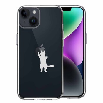 iPhone14Plus ケース クリアにゃんこ りんご さわさわ 薄いグレー スマホケース 側面ソフト 背面ハード ハイブリッド