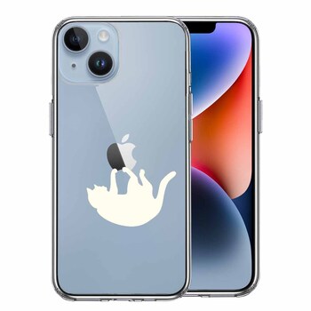 iPhone15Plus ケース クリア ぶらさがりネコ ホワイト スマホケース 側面ソフト 背面ハード ハイブリッド