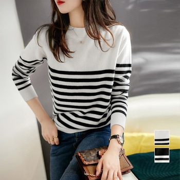 春秋に欠かせない定番のアイテム間違いなし、カジュアルなデザインで若い印象を与えるボーダー柄ニットセータ