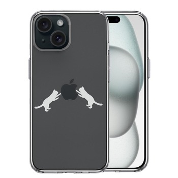 iPhone15Plus ケース クリア にゃんこ りんご 取り合い 薄いグレー スマホケース 側面ソフト 背面ハード ハイブリッド 送料無料
