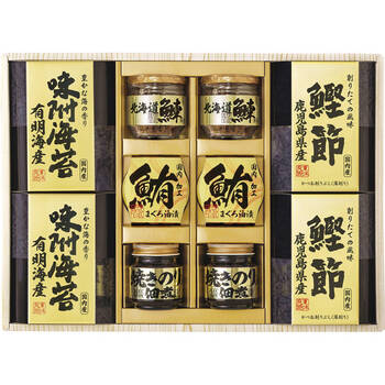 北海道産鰊フレーク:50g・焼きのり入佃煮:85g・鹿児島県産鰹節:2g×3P・有明海産味附海苔:8切10枚・まぐろ油漬け:70g×各2