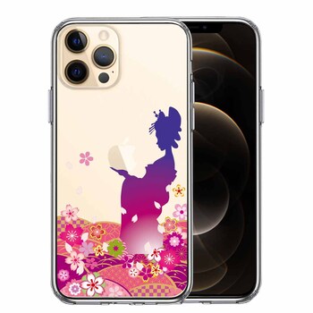 iPhone12Pro ケース クリア 日本女性 着物少女 青紫 スマホケース 側面ソフト 背面ハード ハイブリッド 送料無料