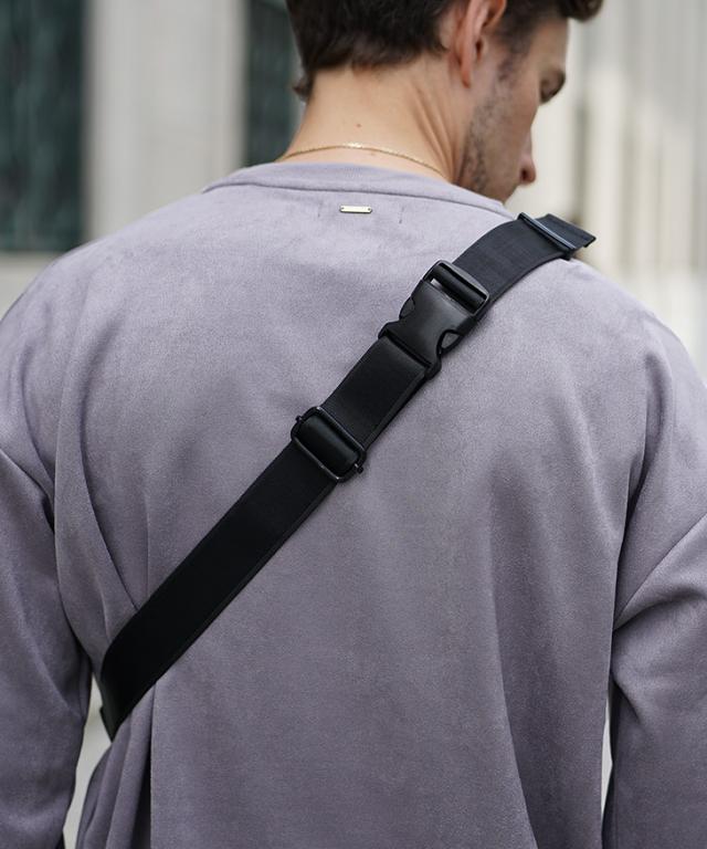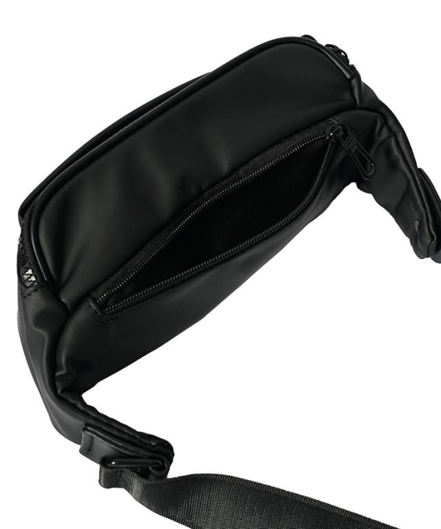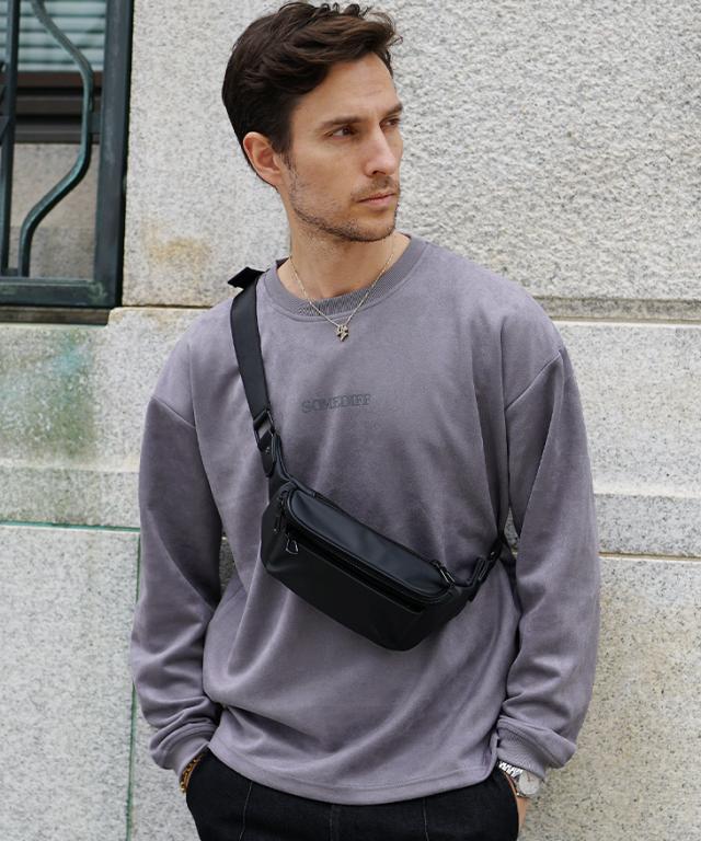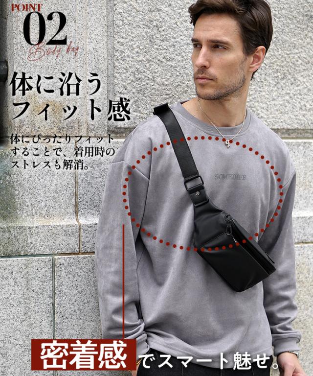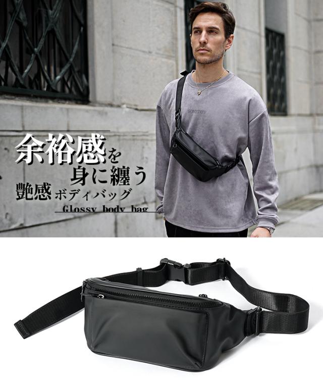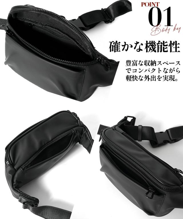 コンパクトな艶感ボディバッグ『PUレザーボディバッグ』【PUレザーボディバッグ】■Design/デザイン無駄のない洗練されたボディバッグ。PUレザーを使用した、マットな艶感で装いにシックな印象をプラス。体に沿うスリムフィットな着用感で軽快かつスタイリッシュな佇まいに。見た目以上に収納口が多く、コンパクトながら収納力が高いためちょっとした外出から遠出まで幅広いシーンで活躍。あると助かる、汎用性の高い逸品。■Material/素材感合成皮革を使用。マットな艶感と肌触りでコーデに馴染みやすい仕様に。