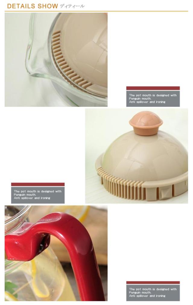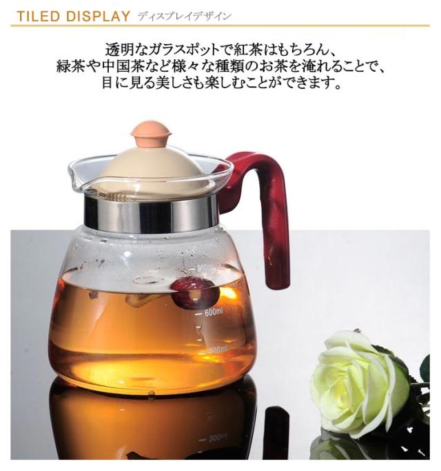 | 直火可の耐熱ガラスのティーポット 蓋と茶こしが1体型になっています。 お茶を注ぐ時には、しっかりと茶葉をこしてくれます。 透明なガラスポットで紅茶はもちろん、 緑茶や中国茶など様々な種類のお茶を淹れることで、 目に見る美しさも楽しむことができます。 全てのパーツがシンプルなデザインなのでお手入れも簡単で、 毎日の生活の中でカジュアルに使用できます。 | |