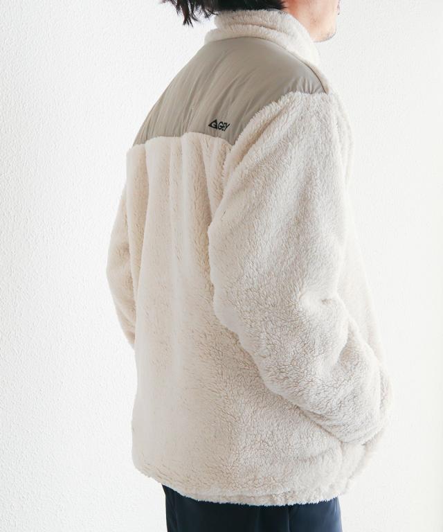 ふんわり柔らかなソフトボア素材に、ナイロン切替をプラスしたスタンドカラージャケット。
