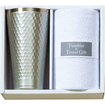 二重構造で飲み物の温度をしっかりとキープするタンブラーと、吸水性にすぐれ、ふんわりとした肌ざわりのマイクロファイバークロスのセットです。
