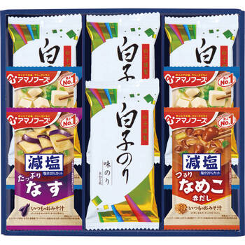 アマノフーズの減塩タイプみそ汁と白子のり味のりを詰合せました。