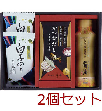かつおだし:4g×8P・伊賀越 天然醸造醤油:200ml×各1、白子だし塩のり:8切5枚×2