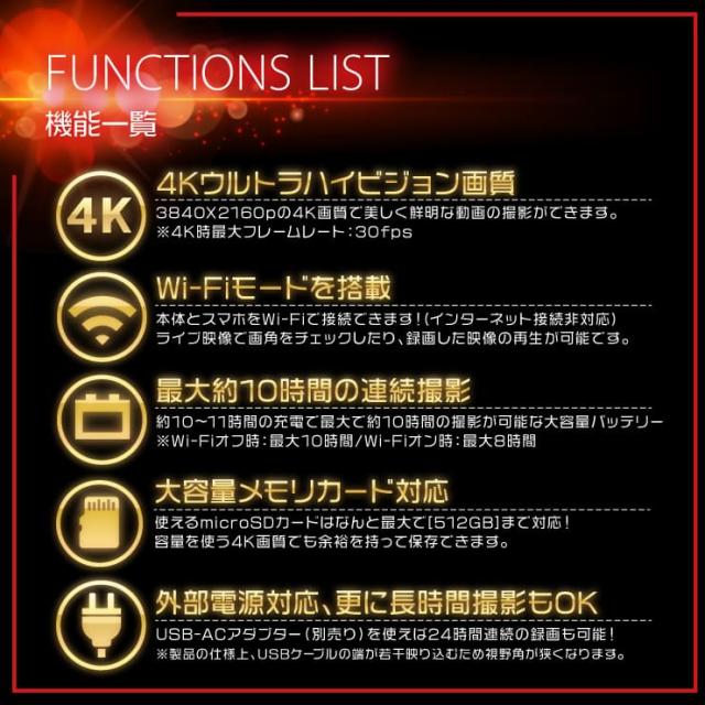 仕様| 機能 | ・動画撮影 ・静止画撮影(アプリのみ) ・Wi-Fi機能(AP接続) ・外部電源機能 ・自動上書 |