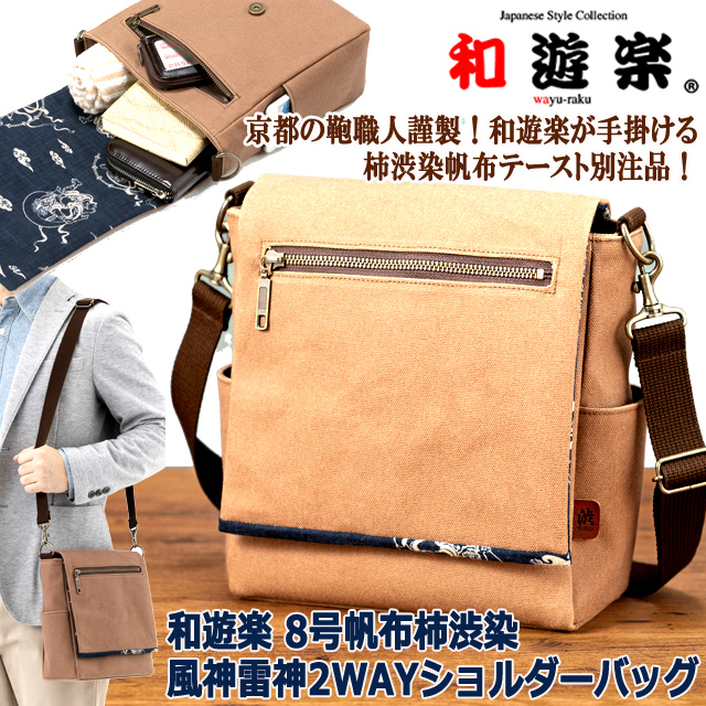 和遊楽 8号帆布柿渋染 風神雷神2WAYショルダーバッグ フラップ ハンドストラップ 京都の鞄職人 工房 経年変化 和の魂 ファスナーポケット 匠
