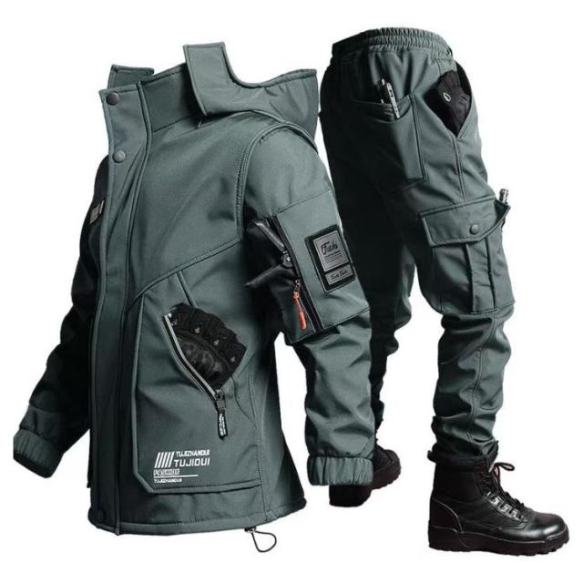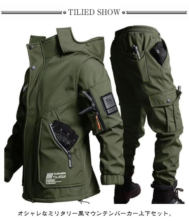 釣り、登山などアウトドアスポーツや屋外作業に最適!オシャレなミリタリー風マウンテンパーカー上下セット。
