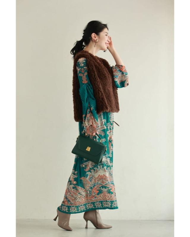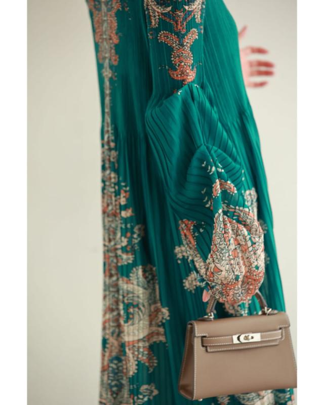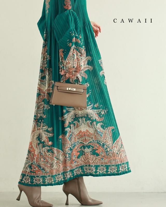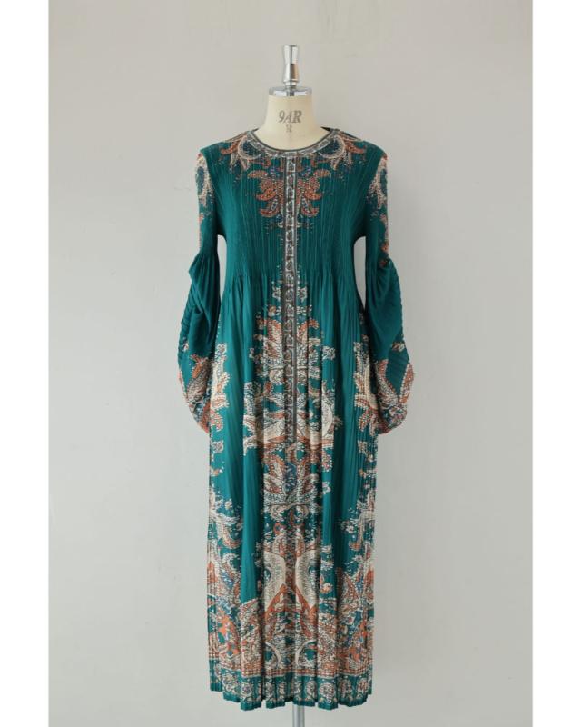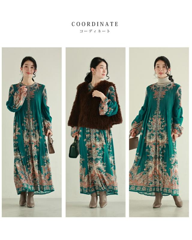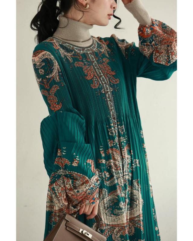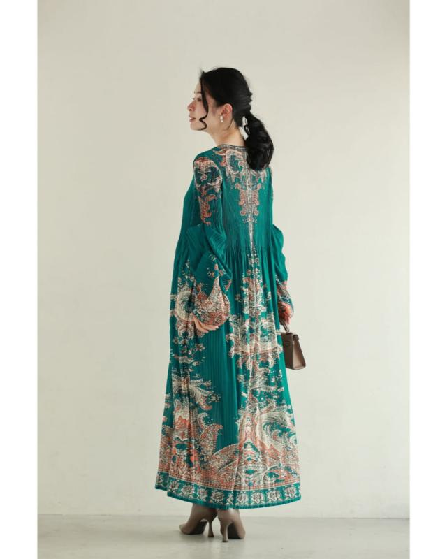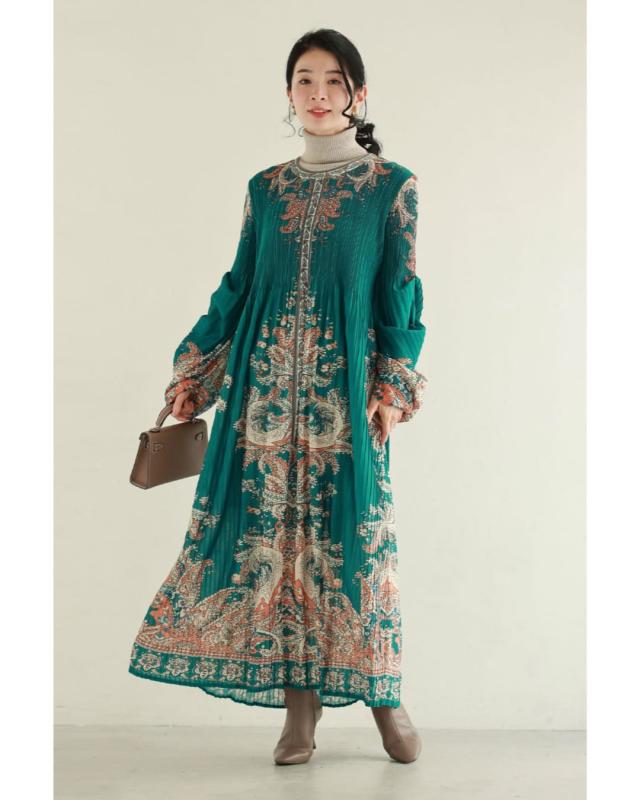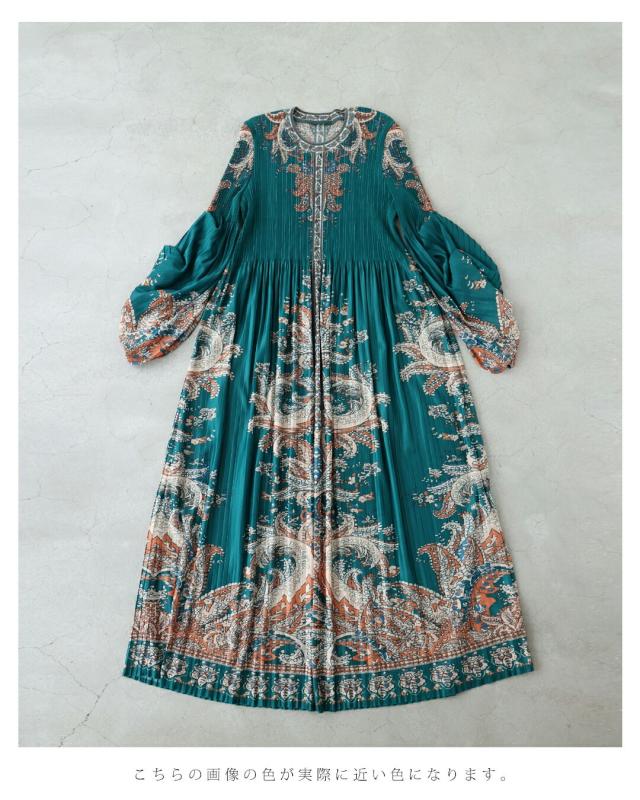 w61626ps 新作 新着 再入荷 CAWAII FRENCHPAVE フレンチパヴェ エレガント ベーシック カジュアル 可愛い かわいい カワイイ おしゃれ オシャレ お洒落 個性 個性的 定番 ベーシック 大人かわいい 大人可愛い 上品 女性らしい デザイン スタンダード ナチュラル きれいめ キレイめ シンプル フェミニン レディース レディースファッション 大人 ママ ミセス 30代 40代 50代 60代 ふんわり 変形 タック袖 華やか エスニック柄 プリーツ ロング ワンピース 長袖 S M L XL 3L ワンサイズ フリー 小さめ 小さい 低身長 痩せ ほっそり 小柄 細身 標準サイズ 大きめシルエット 大きい ビッグシルエット ゆったり F サイズ自由 春 秋 冬 秋服 秋物 冬服 冬物 体型カバー 伸縮 グリーン 緑 柄 総柄 普段着 日常使い デイリー使い おでかけ 旅行 異国感 デザイン性 アコーディオンプリーツ 光沢