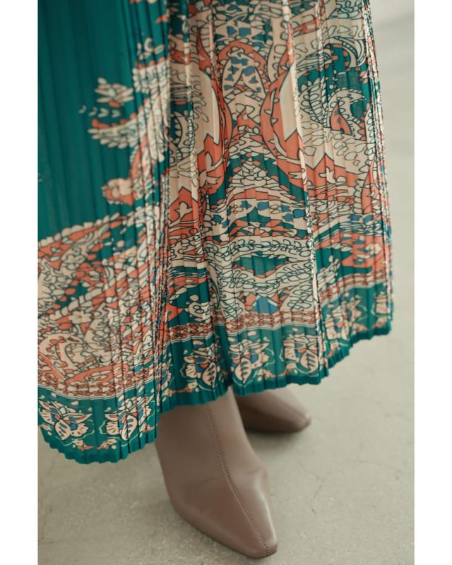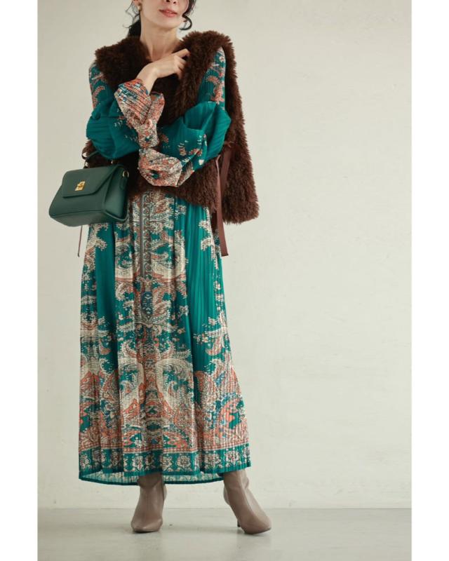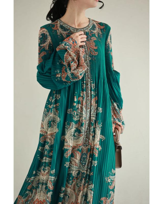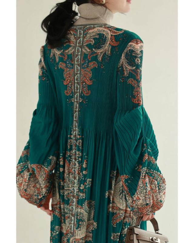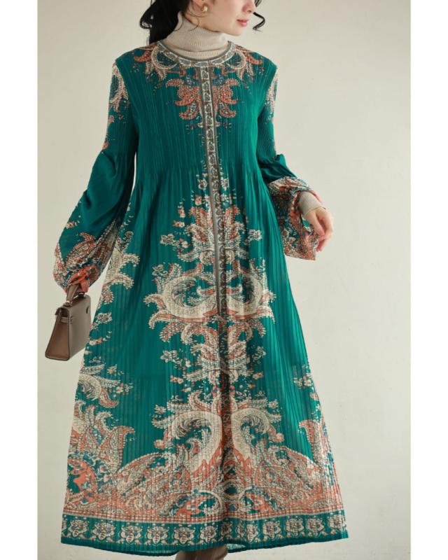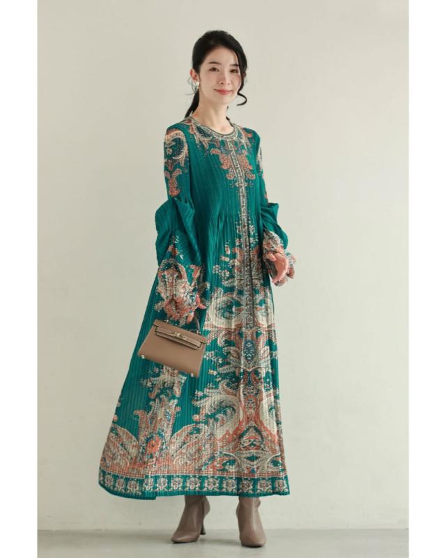新作12月4日 ふんわり変形タック袖の華やかなエスニック柄プリーツロングワンピース ロングワンピース エスニック柄 レディース ファッション 秋服 冬服 着回し 体型カバー cawaii w61626ps S~3L対応 グリーン 日常使い キレイめ シンプル ミセス 30代 40代 50代