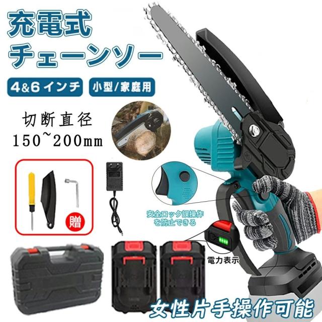 送料無料 電動チェーンソー 充電式 ミニ チェーンソー コードレス 18Vバッテリー互換対応 充電式 小型電動のこぎり 片手 ポータブル伐採 収納箱 電動工具 4/6インチ 日本語説明書