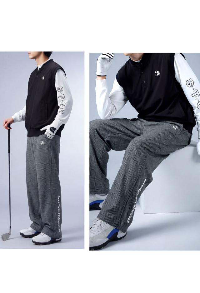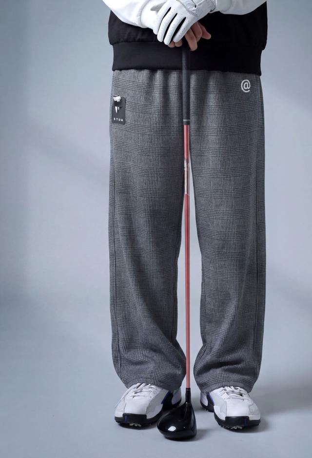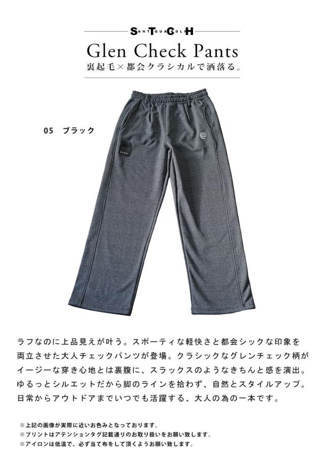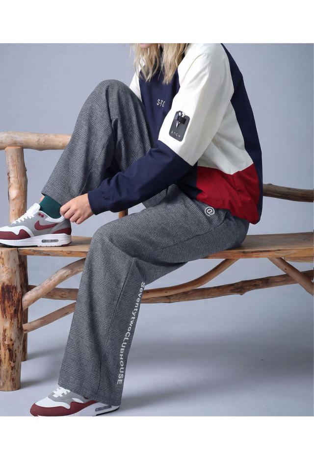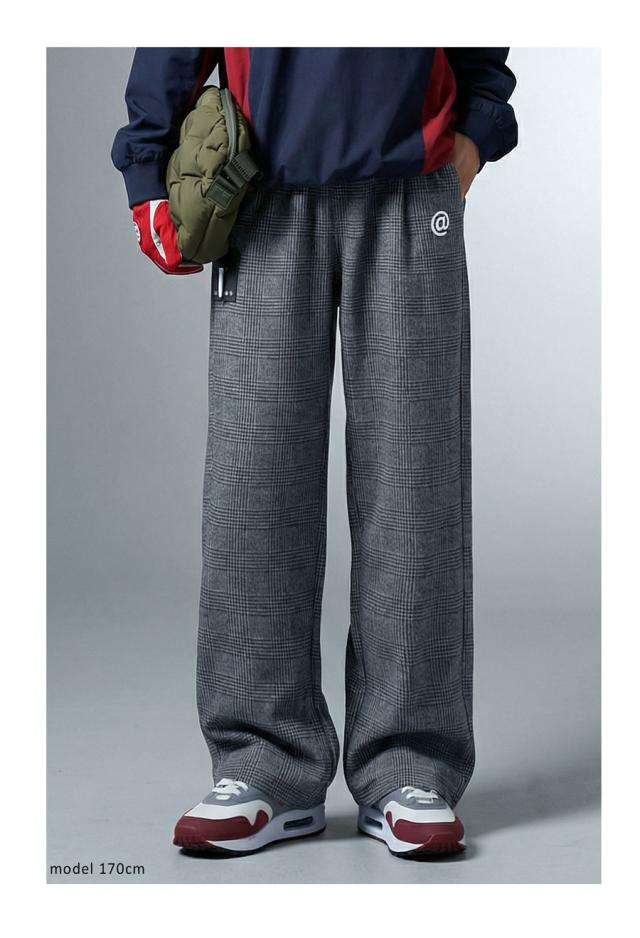 zst-00145 ボトムス ワイドパンツ ロング チェック柄 グレンチェック ロゴ プリント 裏起毛 ストレッチ ゴムウエスト ドローコード付き ゆったり ユニセックス カジュアル きれいめ
