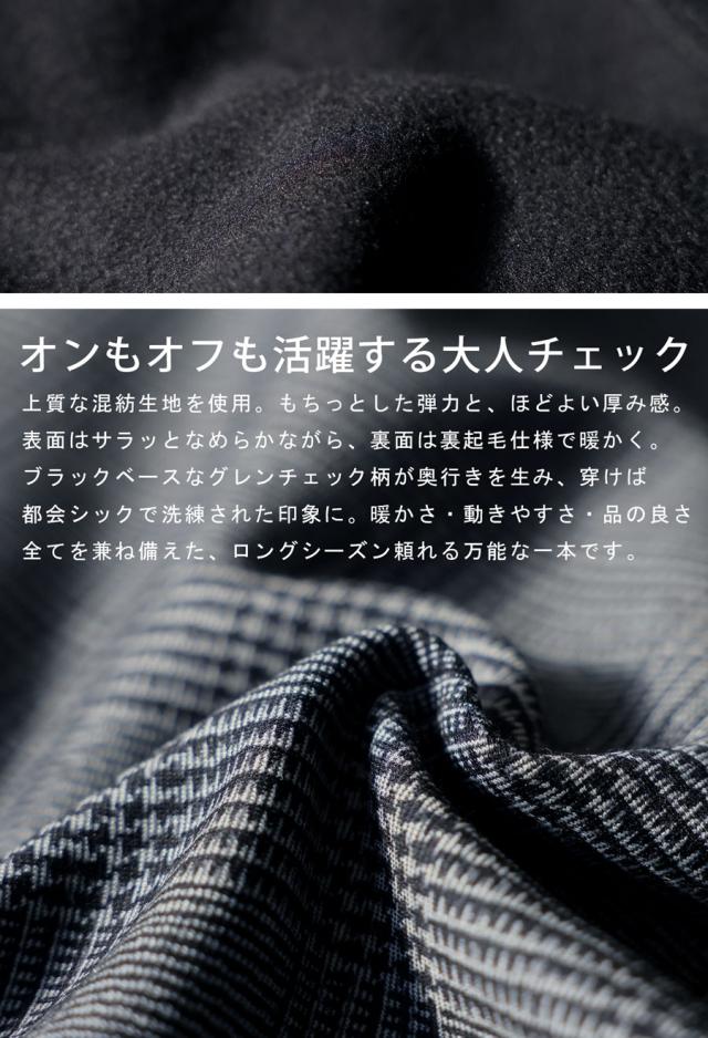 柄は上品なグレンチェックで、表面はさらりとした質感、内側は裏起毛でぬくもりのある着用感。