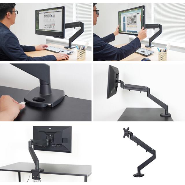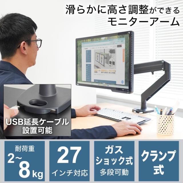 ■工具を使わずに高さ調整ができる、USB延長ケーブル設置可能なガスショック式モニターアーム1面タイプ