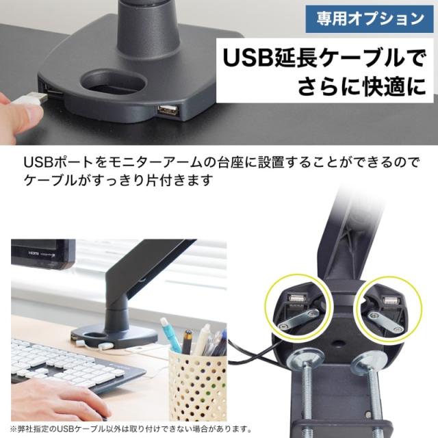 ■モニターアーム本体に別売のUSB延長ケーブルを取り付けることで、邪魔にならない場所にUSBポートの設置ができます